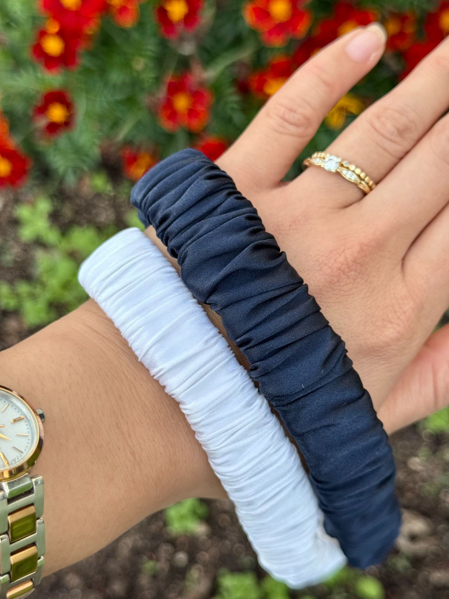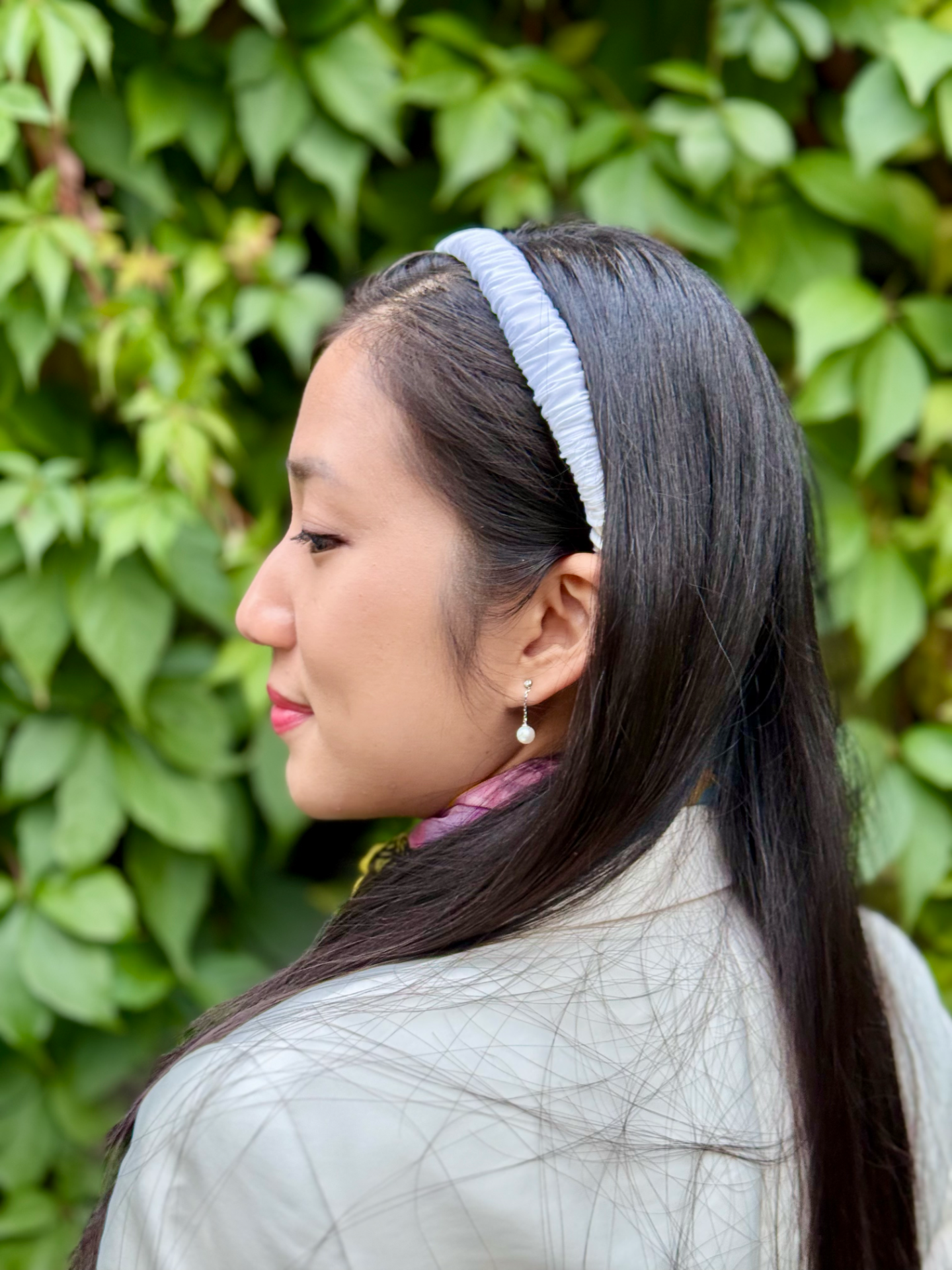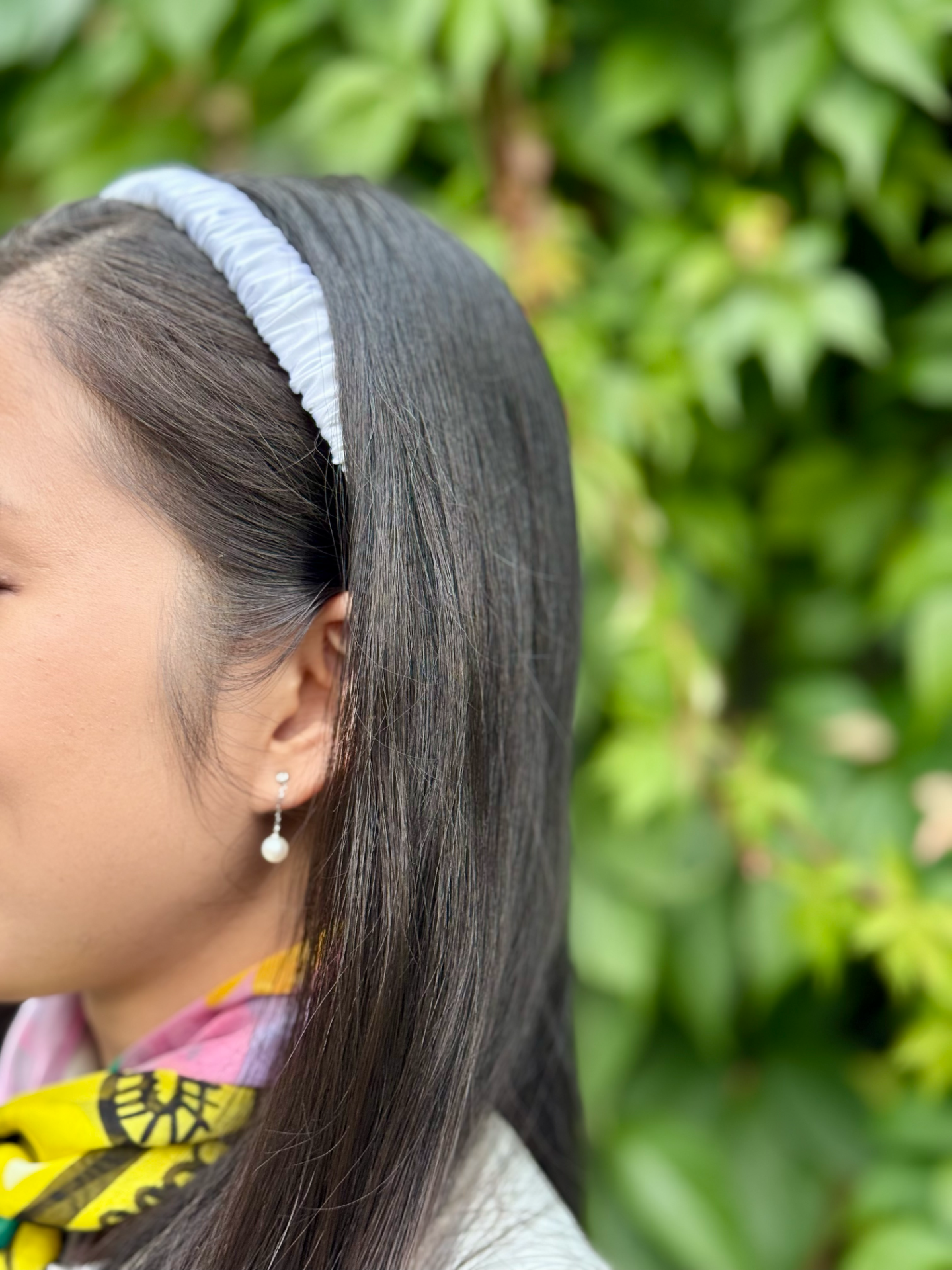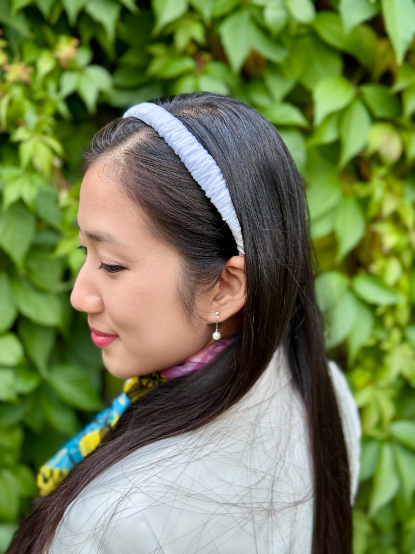 Hedvábná čelenka s řasením. Velikost čelenky díky pružence je od 54 cm do 58 cm. Ideální na každodenní nošení, na domácí wellness, ale i při sportovních aktivitách.
